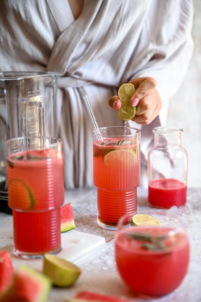 - Wlewamy sok z arbuza, dodajemy plastry z połowy limonki i roztartą w dłoniach miętę (to zwiększa jej aromat).