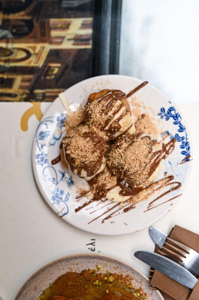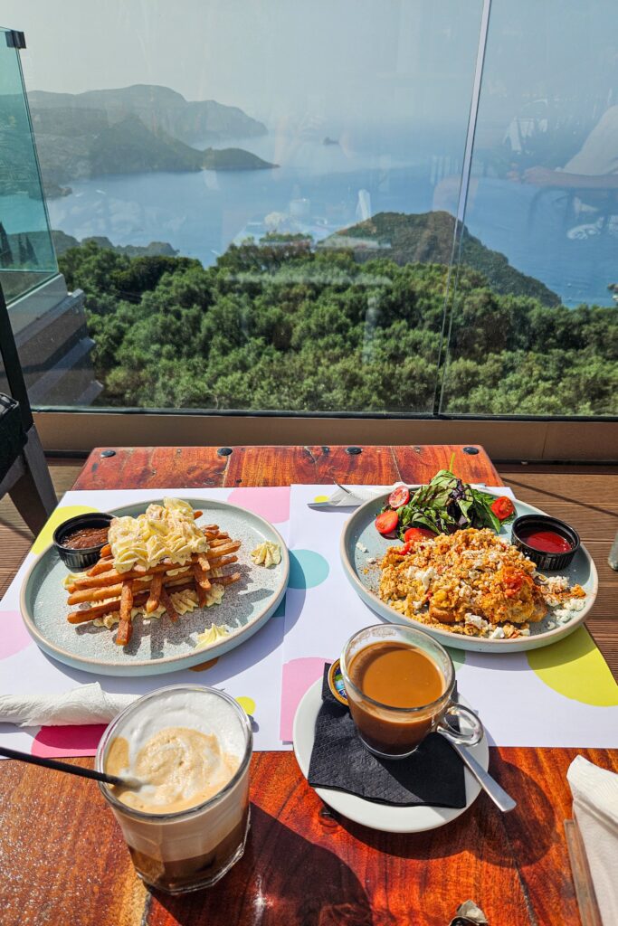 – pyszne lody (mają super smaki jak baklawa, fig pie, oliwka czy kumkwat), pyszna kawka, pyszne śniadania no i ten widok. Przeszklone barierki na tej wysokości i widok na morze kradną serce. W menu jest jedna dość ciekawa propozycja, czyli smażone galeti (smażone pałeczki, nie wiem w sumie z czego) z kremem jak do bougatsy i sosem z suszonych fig inspirowanym wcześniej wspomnianą sykomaidą. Warto spróbować choć to dość ciężka i słodka propozycja na śniadanie.