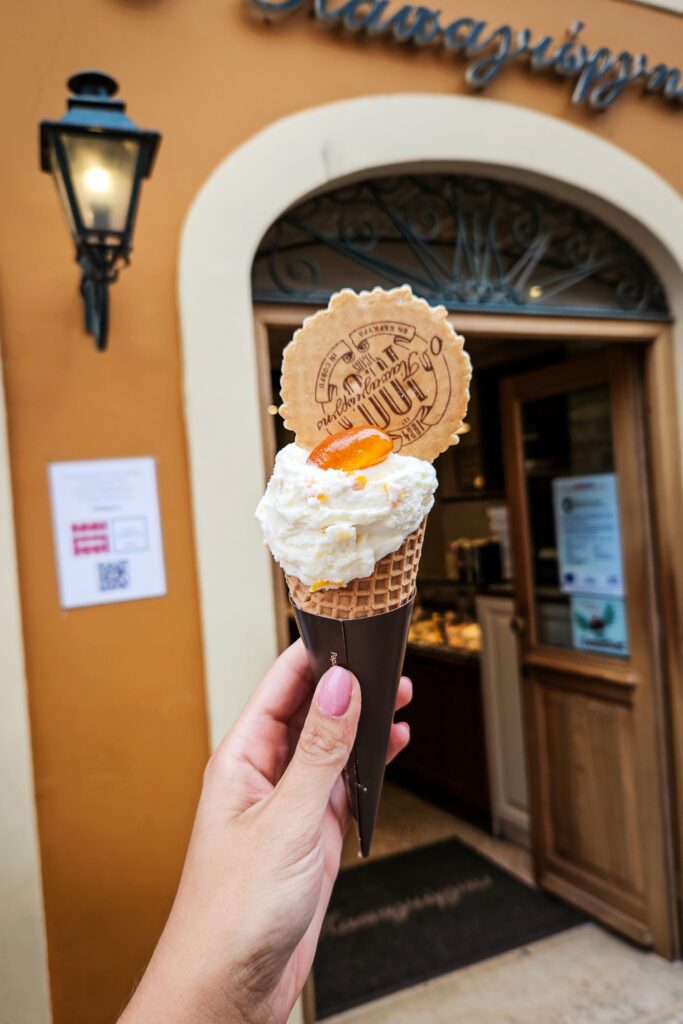 Papagiorgis – cukiernio-lodziarnia. Na temat wypieków się nie wypowiem, ale lody tam to strzał w dziesiątkę. Poza klasykami jak wanilia i czekolada dostępne są lody o smaku kumkwatu (przepyszne!), ciemnej czekolady z kumkwatem czy mascarpone z figami choć klasyczne smaki jednak przeważają.