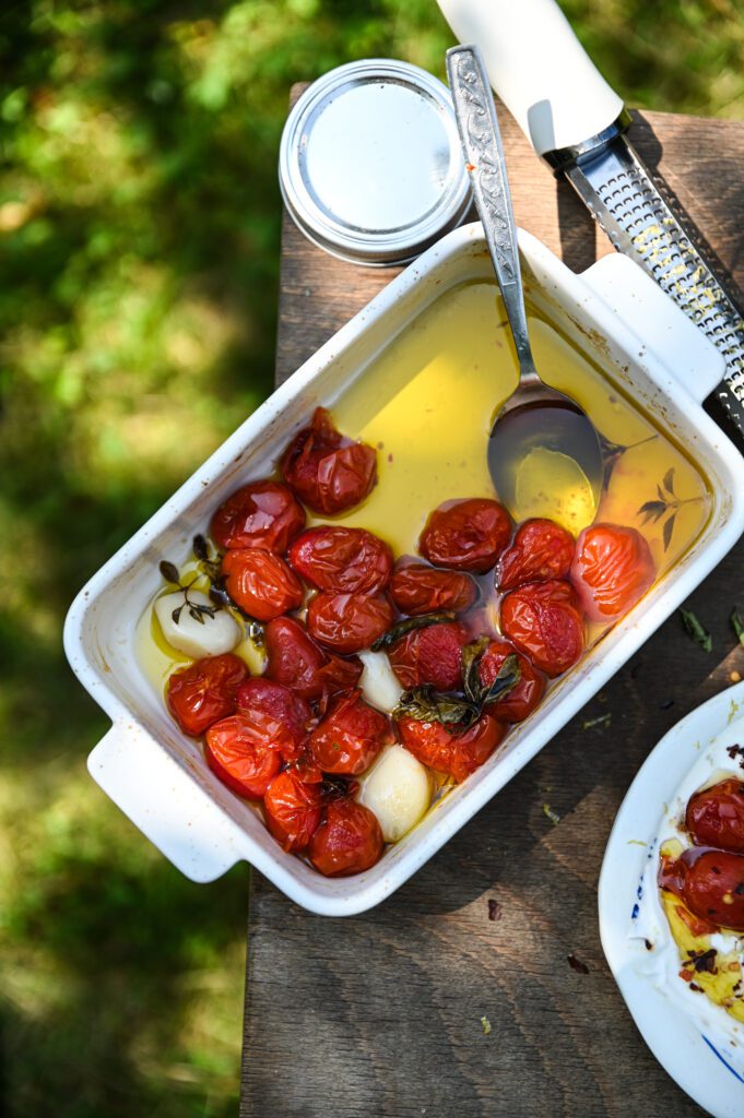 4. Kremową fetę podajemy z konfitowanymi pomidorkami.